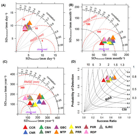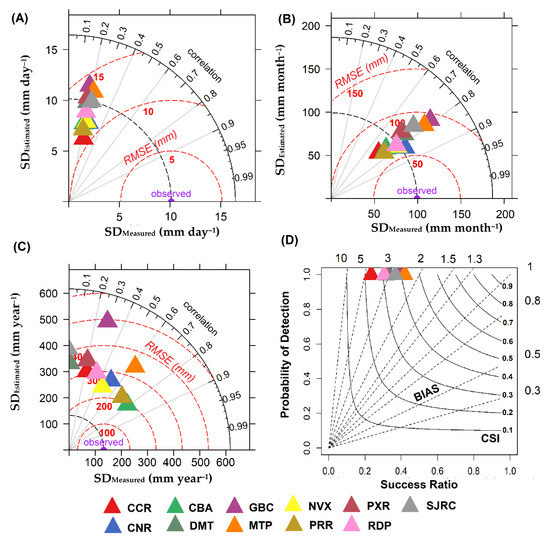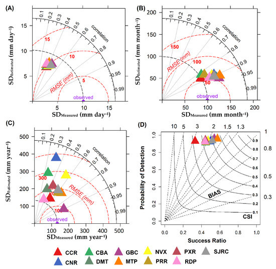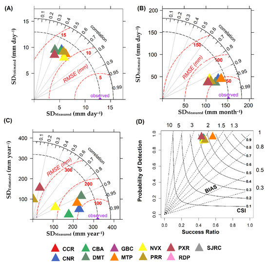 Taylor diagrams showing the comparisons of (A) daily (mm day−1), (B) monthly (mm month−1), and (C) annual (mm year−1) measured and estimated precipitation, as well as (D) the performance diagram of the TRMM product at each of the weather stations in the state of Mato Grosso, Brazil. In panels (A–C), the Pearson correlation coefficient (r) was represented by the azimuth angle (black outlines), the RMSE was represented by the red dashed outlines, and the standard deviation (SD) was indicated by the x and y axes, respectively. In panel (D), the probability of detection (POD) is represented on the x and y axes; the BIAS was indicated by the dashed black lines; and the critical success index (CSI) was represented by continuous black lines. For (A), the daily values for the entire study period were averaged, while for (B), the total monthly values for all months during the study period were averaged, and the annual values in (C) were the annual values averaged for all years during the study period.
