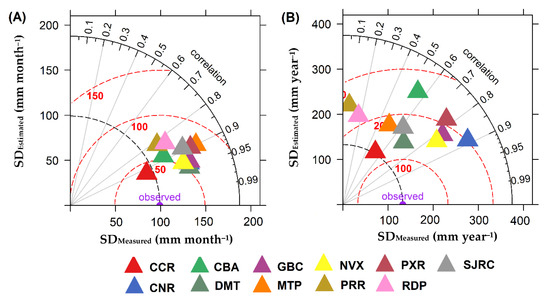 Taylor diagrams showing the comparisons of (A) monthly (mm month−1) and (B) annual (mm year−1) of the GPCP product at each of the weather stations in the state of Mato Grosso, Brazil. In panels (A,B), the Pearson correlation coefficient (r) was represented by the azimuth angle (black outlines), the RMSE was represented by the red dashed outlines, and the standard deviation (SD) was indicated by the axes x and y, respectively. For (A), the monthly values for the entire study period were averaged, while for (B), the annual values for all years during the study period were averaged.