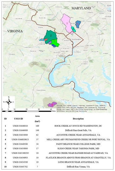 Figure 1 displays the location of the 10 watersheds located across the DMV selected for this study. Moreover, a USGS station is located at the discharge point (or outlet) of each watershed. Watersheds and their associated USGS IDs (Hydrological unit code) are listed based on their size from large to small in the legend of Figure 1. In the discussion of results, the first three watersheds are considered large, watersheds 4, 5, and 6 medium, and the last four are classified as small. Watershed areas vary from 7 to 168 km2 with an average of 50 km2 and a standard deviation of 56.8 km2.