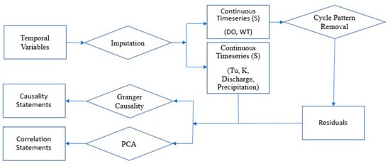 Another powerful multivariate analysis technique to investigate causal information and hidden relationships among variables is Granger causality, one of the most common data-driven approaches to explore cause-and-effect relationships [18,19] evaluated the causality between daily and monthly water temperatures in the Notec river in Poland and proved that the forecasting river water temperature was more accurate if air temperature of the previous day was considered. Val et al. [20] studied the impact of anthropogenic and natural changes in the Ebro river basin in Spain using Granger causality. Furthermore, Sun et al. [21] coupled the feature selection method with Granger causality to overcome the two-dementia feature selection problem (i.e., selecting feature and their window size of effective lagged values). Zelaya et al. [22] combined Granger causality with vector auto-regressive models to assess the relationship between richness and geochemistry in three designated wells in Oak Ridge, TN. In another study, Salvucci et al. [23] investigated the Granger causality of soil moisture on precipitation in 18 stations in Illinois and concluded that soil moisture was not linked to precipitation alone.