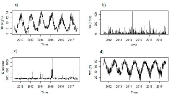 Secondly, time series of environmental variables often show complex cyclic patterns. Some of the data considered here exhibit daily and seasonal patterns. For instance, as shown in Figure 3 for the Difficult Run watershed near Vienna, VA during a 6-year period (June 2011–August 2017), both water temperature and DO present a strong seasonal pattern. Moreover, such variables present a diurnal cycle (temperature is higher during the day and lower at night). On the other hand, other variables, like Tu and K, are more closely related to streamflow (which is driven by precipitation events) and do not present any strong temporal cycle in their timeseries (Figure 3).