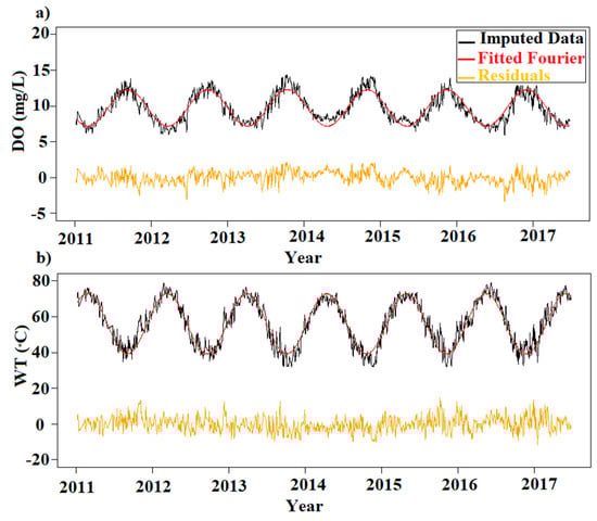 Time series, fitted Fourier series, and residuals (i.e., time series from which cyclic patterns are removed) for (a) DO and (b) water temperature.