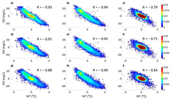 Density scatterplots of de-seasonalized DO against water temperature for a large watershed (a,d,g); a medium watershed (b,e,h); and a small watershed (c,f,i) and for three different lags: 1 day (a–c), 2 days (d–f), and 3 days (g–i). Correlation coefficients for each case are also shown.