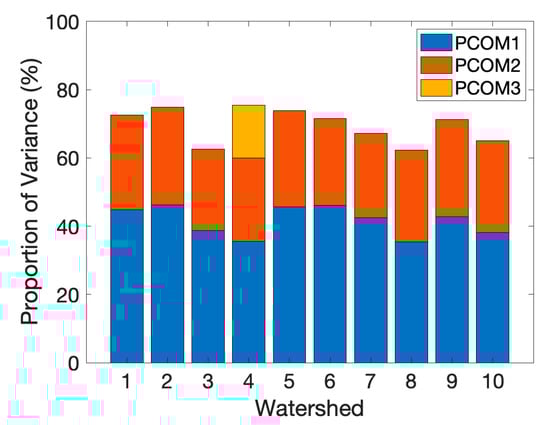 Proportion of variance explained by each principal component for the 10 watersheds.