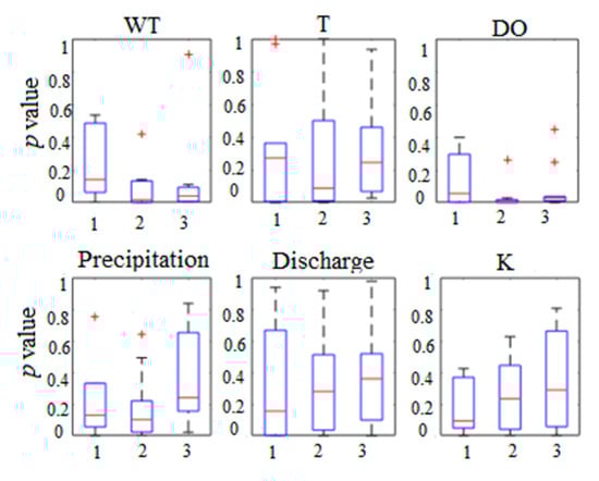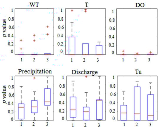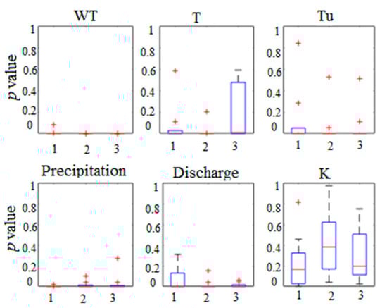 Box plots of p-values resulting from the Granger causality test when WT is Granger caused by DO, T, Tu, precipitation, discharge, and K based on a lag time of 1, 2, and 3 days and performed for each watershed. The 25th and 75th percentiles are shown by the blue boxes, while the central red line shows the median. Whiskers extended to minimum and maximum do not consider the outliers, shown with red crosses.