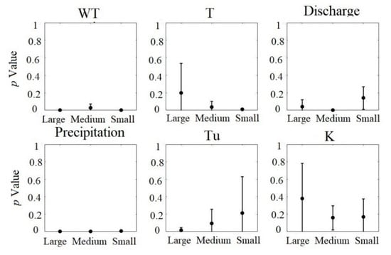 Box plots of p-values resulting from the Granger causality test based on watershed size (small, medium, and large) when DO is Granger caused by WT, T, discharge, precipitation, Tu, and K. Dots show the median and the vertical lines indicate +/− standard deviation.