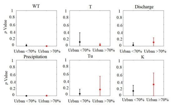 Figure 12 displays Granger causality test results when DO is caused by the other six variables based on the level of urbanization in the watersheds. Watersheds 1, 2, 4, 5, and 10 show a level of urbanization lower than 70%, whereas the others are considered highly urbanized. Watersheds characterized by less urban area show stronger Granger causality relationship when WT, discharge, precipitation, and Tu are the cause of a change in DO. When soil infiltration is slow (which is commonly the case in more developed regions), the retention time is possibly shorter than 1 day, which is why such relationships are weaker.