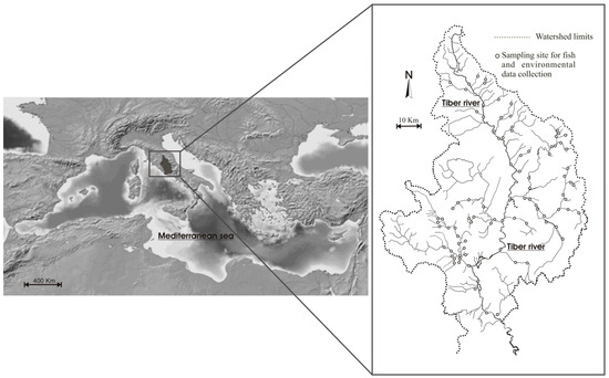 The study area includes the northern portion of the Tiber river basin, for a total extension of 5133 km−2, equal to 30% of the total catchment area (Figure 1). It is located within the Mediterranean region, where the climate is characterized by dry periods in summer and wet periods in winter [43]. These meteorological features make aquatic environments particularly vulnerable to potential climatic changes effects, in terms of rising water temperatures and decreasing precipitations [11,44]. In fact, the geological characteristics of the upper Tiber river basin, which is predominantly impermeable, make the flow rates of the watercourses closely linked to rainfalls [45]. The high-water demand for irrigation purposes contributes to aggravate the water shortage, particularly during drought periods. A recent study provided evidence for some effects of climate changes within the Tiber river basin, in terms of decreasing flow rates over the last 100 years, and increasing water temperatures over the last 15 years, with a magnitude of 0.4 °C [41]. As mentioned above, the whole hydrographic network is highly fragmented due to the presence of many weirs and dams [41].