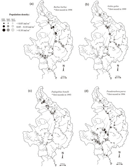 Comparison of the distribution and population abundances between the periods 1998–2004 (black circles), 2005–2011 (dark grey circles), and 2012–2018 (light grey circles) for: (a) Barbus barbus; (b) Gobio gobio; (c) Padogobius bonelli; (d) Pseudorasbora parva.