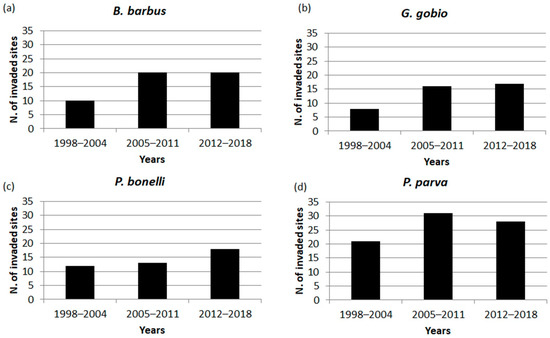 For all the four species, the number of invaded sites was closely related to residence time (r = 0.79; p = 0.001). For B. barbus the number of colonized sites over time was stable in the last two census period and stood at a total of 20 sites (Figure 3a). The invaded sites progressively increased for G. gobio, until reaching a total of 17 sites in the most recent years (Figure 3b). For P. bonelli the number of occurring sites remained quite stable and equal to 12 and 13 in the first two census periods, respectively, while an increase of 5 sites was observed in more recent years (Figure 3c). P. parva was characterized by the greater number of colonized sites compared to other species, with 31 sites invaded in the period 2005–2011; a slight decrease in the last census period was observed, when the number of invaded sites was 28 (Figure 3d).