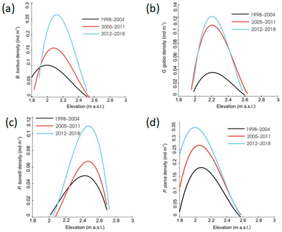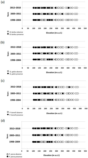 For all the four species the GLM results showed a progressive increase of population abundances over the three census periods (Figure 9). For B. barbus and P. bonelli a gradual shift toward higher altitudes has been also observed (Figure 9a,c). For G. gobio and P. parva, the analysis did not reveal significant changes in the elevation preferences of the species (Figure 9b,d).
