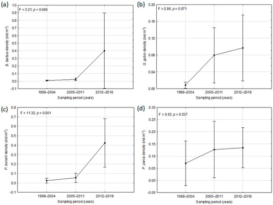 For all species there was an increasing trend over time of the mean population density values, even if, except for P. bonelli, in all other cases the results were not statistically significant at the rmANOVA (Figure 5). B. barbus and P. bonelli were characterized by large population size especially in the last sampling period, when the mean abundance values exceeded 0.4 ind m−2 for both species (Figure 5a,c). In the case of G. gobio and P. parva the mean density values were always below 0.13 ind m−2 (Figure 5b,d).