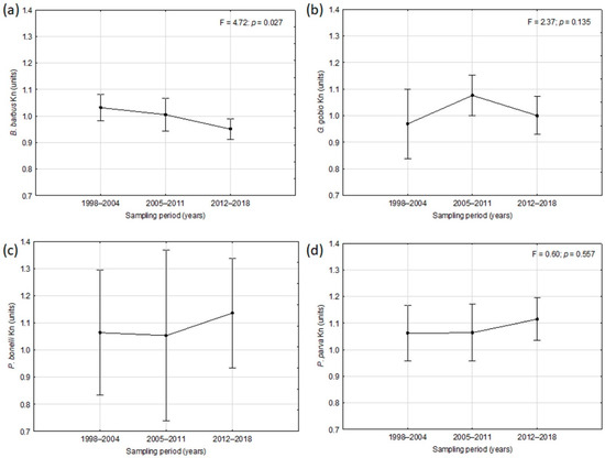 As regards the body condition, a progressive decreasing trend over time of the mean Kn values was observed for B. barbus, even if the average values always remained almost close to unity, that could be considered the optimal value for this parameter (Figure 6a). On the contrary, an increasing trend in the last period of the condition factor was observed for P. bonelli (Figure 6c) and P. parva (Figure 6d), for which in the two last sampling periods the values remained always above 1.0 unit. For G. gobio a fluctuating trend was observed, even if also in this case the Kn mean values remained close to 1.0 (Figure 6b). Except for B. barbus, for all the other species the results were not statistically significant at the rmANOVA.