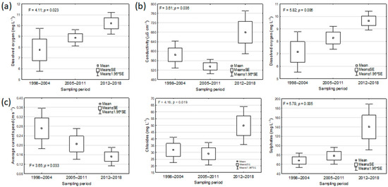 Ecological requirements: trend over time of the mean values of: dissolved oxygen for Barbus barbus (a); conductivity and dissolved oxygen for Padogobius bonelli (b); average current speed, chlorides, and sulphates for Pseudorasbora parva (c). For each species, only the occurring sites in the census periods 1998–2004, 2005–2011, 2012–2018 were considered. Only statistically significant results at ANOVA are shown.