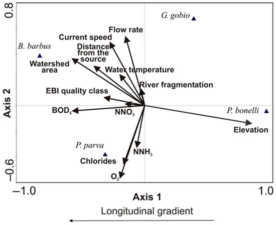 The axes 1 and 2 of CCA explained 92.8% of the total variability and the analysis was highly statistically significant at the Monte Carlo test (F = 8.50, p = 0.001, total inertia = 2.028). Altitude and river fragmentation degree were significantly positively related to the first axis of CCA, which reflected the upstream-downstream gradient of the watercourses (Table 1). BOD5, chlorides, dissolved oxygen, NNH3, NNO3, and watershed area showed a significant inverse relationship to Axis 2 (Table 1). The scattered distribution of points indicating B. barbus, G. gobio, P. bonelli and P. parva positions, suggested that the 4 species inhabit different river stretches with different environmental characteristics within the study area (Figure 8). For P. bonelli the projection point showed the close relation of the species with altitude, while G. gobio was placed in the river stretches located a little more downstream, where the flow rates are higher. P. parva and B. barbus preferentially colonized the downstream reaches of larger rivers, where the water quality is rather poor, and the water temperature is higher.