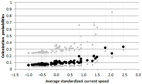 Gobio gobio: effects of average current speed on colonization probabilities from the best informative models. Dashed gray lines indicate upper and lower 95% confidence intervals.
