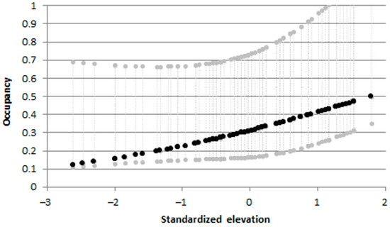 Pseudorasbora parva: effects of elevation on occupancy from the best informative models. Dashed gray lines indicate upper and lower 95% confidence intervals.