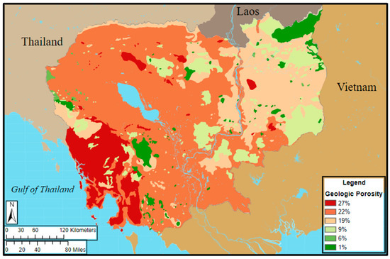 Geologic porosity map of Cambodia. Adapted from Gleeson’s et al. [31] GLMYPHS database.