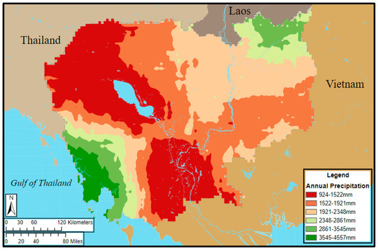 Annual precipitation map of Cambodia. Adapted from UCSB’s [32] CHIRPS database.