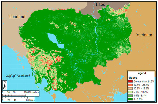 Calculated slope map of Cambodia. Adapted from Open Development Cambodia’s [33] georelief map.
