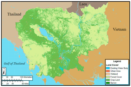 Land cover refers to how land is being used in a particular area. Constructing water harvesting reservoirs could require extensive earthwork. Thus, urban areas and forested areas are less suitable than open areas. Land cover was extracted from the Regional Land Cover Monitoring System developed by SERVIR-Mekong [34]. Land cover in Cambodia was reclassified into six sub-criteria, including existing water bodies, wetlands, forests, urban, cropland, and barren. To create a more conservative model, rice paddies were included under croplands instead of wetlands. While rice paddies retain water during the wet season, most run dry during the dry season [44]. Figure 5 shows a land cover map of Cambodia.