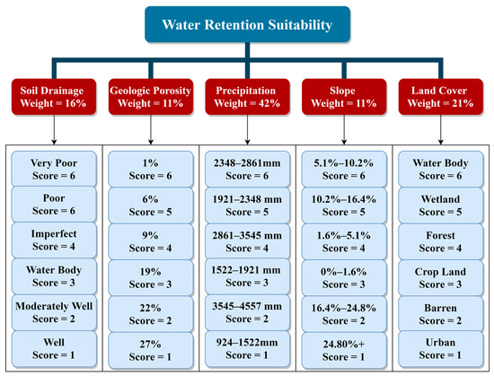 Suitable water harvesting sites were identified using a weighted linear combination. The weighted linear combination was calculated using Equation (4), where is the overall suitability score for an area, is the criteria weight, and is the associated sub-criteria score [47].