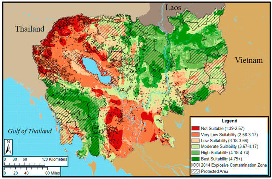 In addition to the engineering criteria, two overlays were added to show areas where work could be potentially restricted. Table 1 details the source and location of the data. According to the government, 35% of Cambodia’s land is considered restricted due to protected areas or the possible presence of unexploded ordinances. These constraints may not completely inhibit the construction of water harvesting reservoirs; however, special considerations and precautions would need to be taken. Future studies and projects would need to consult with the Government of Cambodia and local stakeholders to determine if water harvesting reservoirs would be appropriate in these locations. Protected zones include national parks, wildlife sanctuaries, protected landscapes, multiple-use land, natural heritage sites, Ramsar-wetland sites, and marine national parks [36]. The contamination areas show areas expected to still contain landmines and unexploded ordinance of war as of 2014. In 2010, the Cambodian Mine Action Center estimated between four to six million explosive ordinances still scattered throughout the country from the Khmer Rouge [35,48].