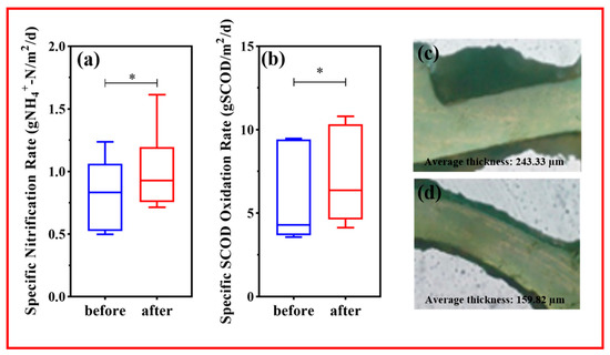 The average nitrification rate before and after cycle cleaning process (p = 0.037, n = 7) (a), the average soluble chemical oxygen demand (SCOD) removal rate before and after cycle cleaning process (p = 0.044, n = 7) (b), digital photo of biofilm before cycle cleaning (c), and digital photo of biofilm after cycle cleaning process (d).