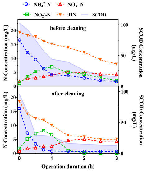 A typical cyclic test for degradation of SCOD and nitrogen before and after cycle cleaning process.