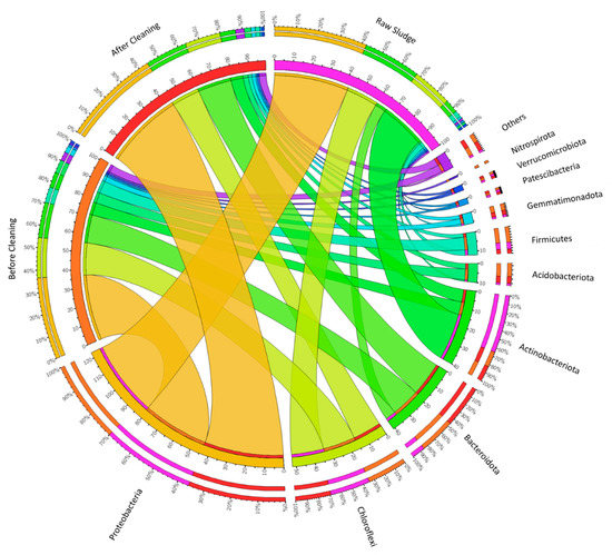 In order to gain a better understanding of the nutrient’s removal mechanism in HPBR before and after cycle cleaning, microbial communities of raw sludge and cultivated biofilm (before and after cycle cleaning) were investigated by high-throughput sequencing. First, the compositions of key bacterial at phylum level were analyzed (Figure 6). The dominant Proteobacteria was observed in all samples, which accounted for around 40% of the community. Proteobacteria is considered as one of the most common nitrogen removing related microbes [21], and its stable presence in HPBR ensured the stable removal efficiency of ammonia. In addition, Bacteroidota, which played an important role in organic matter degradation [22], increased from 6.11% (raw sludge) to 16.49% (before cleaning) and 18.73% (after cleaning). This might be one of the important reasons for the efficient organic matter removal performance in HPBR. The proportion of Nitrospirota (also known as Nitrospirae), which is related to nitrite oxidation process [23], increased from 0.03% (raw sludge) to 1.17% (before cleaning), then decreased to 0.35% (after cleaning). The decreased proportion of Nitrospirota after cleaning led to a compromised nitrite removal problem, which was in accordance with the typical cyclic test (Figure 5) where a significant nitrite accumulation was observed after cleaning. However, the recovery of the Nitrospirota in HPBR is rapid because nitrite is all oxidized at 2 h after cycle cleaning.