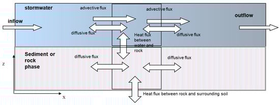 For a conceptual model shown in Figure 1, the cooling trench is a porous matrix composed of rock or other media and stormwater. The major processes for heat transfer shown in Figure 2 are rock–water conduction, advective transport of heat in water, and diffusive transport of heat in water and sediment. The governing mathematical equations for the liquid and solid phases are based on the following assumptions: