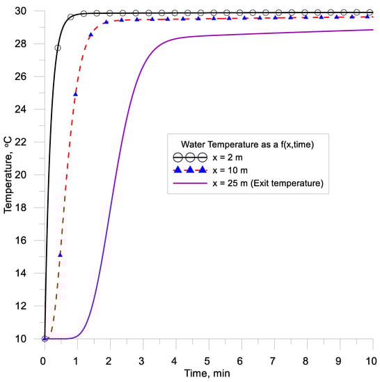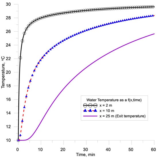 Using Equation (4) in Table 2 (except that the soil temperature was assumed equal to the rock temperature, i.e., no impact of stormwater heating the surrounding soil matrix) for a flow rate of 0.03 m3/s (about a 30 min detention time), the spatial and temporal variation of temperature is shown in Figure 9. The change in temperature of the sediment as a function of position for the same conditions is shown in Figure 10. For both the rock matrix and water, longitudinal diffusion was assumed to be negligible.