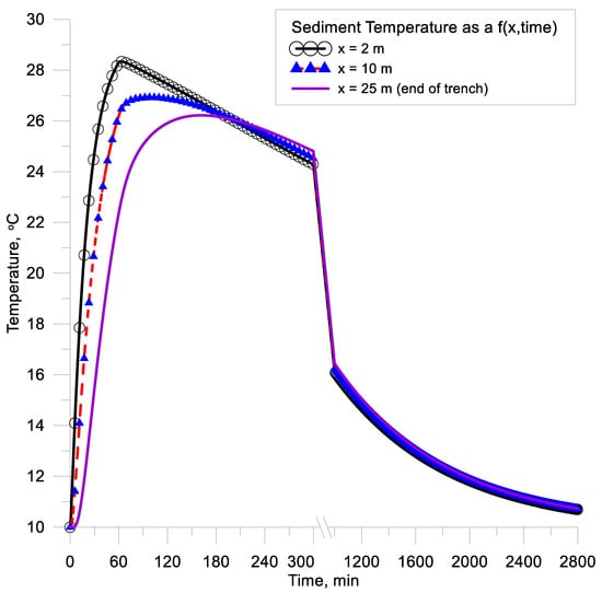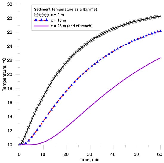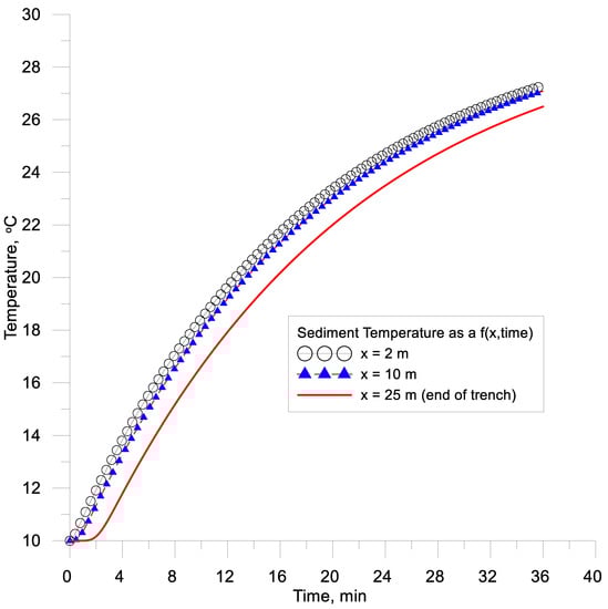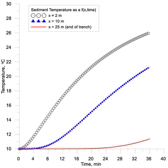 Using Equation (4) in Table 2 for the case of a flow through the cooling trench of 0.52 m3/s (about a 2 min detention time), the spatial and temporal variation of temperature is shown in Figure 11. The change in temperature of the sediment as a function of position for the same conditions is shown in Figure 12. Here, after about two detention times, the effectiveness of the cooling trench was compromised.