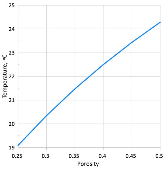 Equilibrium temperature of the stormwater and rock in a batch cooling trench as a function of porosity (Equation (8) in Table 2) with stormwater initially at 30 °C and rock media at 10 °C.