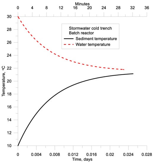 Equilibrium temperature for rock and water for a batch reactor (Equation (6) in Table 2). The initial rock media temperature was 10 °C and the initial stormwater temperature was 30 °C.