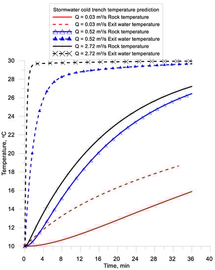 At the start of the simulation, t = 0 days, the water in the trench was in equilibrium with the rock, i.e., the water initial temperature was the temperature of the rock media. Model predictions of exit temperatures for these flow rates are shown in Figure 8 assuming a constant inflow flow rate and stormwater inflow temperature. These results show that within about twice the detention time of the flow rate the effectiveness of the cooling trench was reduced since exit temperatures significantly approach the inflow temperature. Hence, design volume impacts cooling effectiveness and should be based on the storm event that is being mitigated.