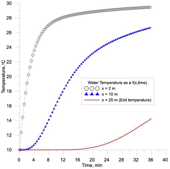 The temperature of the water and solid media as a function of time and longitudinal distance through the domain can be computed using a finite difference form of Equations (1) and (2). An example of this calculation using the parameters in Table 3 and an inflow flow rate of 0.03 m3/s is shown in Figure 3 for water temperature and Figure 4 for media temperature. With a water detention time of about 30 min, there was significant cooling over this period, but the cooling trench exit temperature warmed considerably within two detention times. This implied that longer stormwater flush events did not benefit from the underground cooling directly even though they would benefit from being shielded from solar radiation if this were a daytime event.