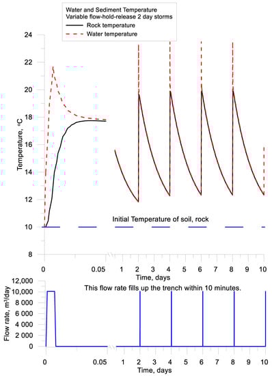 This case is similar to that in Section 4.4 but with soil cooling between storm events. A storm event was assumed to occur every 2 days, and the first 10 minutes of the summer storm was directed into the cooling trench. Once the trench was filled, the stormwater bypassed the cooling trench. Equation (9) from Table 2 was used for this analysis. This simulation includes the cooling potential of the surrounding soil lowering the temperature of the rock between summer storms. Figure 13 shows the temperature over a period of 10 days for both the water and the rock media. This shows that the storm with 30 °C water approached equilibrium with the rock media but cooled over time due to the effect of the surrounding soil. After each successive storm, the maximum rock media temperature increased from 17.7 °C (for the first storm) to 19.9 °C (for the last storm) as the impact of successive storms on the rock media did not allow it to reach its initial temperature of 10 °C at the beginning of each storm. The stormwater release temperature also increased from 21.7 to 23.5 °C at the end of the successive storms. In both the rock media and water, the maximum temperatures after a storm event did not continue to increase but reached an equilibrium.