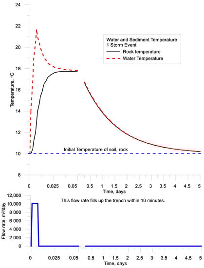 How quickly the water and rock media temperature change if the water and rock were in a well-mixed (batch) reactor can be described by Equation (6) in Table 2. This equation can show the ultimate capacity of the rock thermal mass to cool a specific volume of water. Figure 7 shows a solution using the parameters values in Table 1 where after about 30 min the rock and water have reached an equilibrium. With a volume of the water of about 70 m3 and a volume of rock of about 130 m3, the mixed temperature approached 21.5 °C based on Equation (8).
