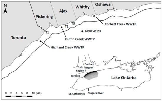 The need to direct management attention to nearshore waters brings with it challenges, as this coastal environment serves simultaneously as a source of drinking water, a recreational resource, the repository for wastes (treated at varying levels of efficiency) and the point of entry for nutrients sustaining lakewide ecosystem function. Eutrophication of many inland waters is attributable to the widespread application of secondary (2°) treatment of wastes produced by a burgeoning and increasingly urbanized population []. Along the western and adjoining northern shore of Lake Ontario (Figure 1), lies an almost unbroken urban landscape extending from St. Catharines, ON near the Niagara River to Oshawa, ON near the eastern boundary of the Greater Toronto Area (GTA) [] (2003, p. 627). Rising populations occupying the coastline turn almost exclusively to Lake Ontario for both water supply and wastewater disposal; even as current treatment technologies seem to be nearing their practical design limits [] (p. 628). Community and regional wastewater treatment plant (WWTP) effluents are discharged to the Lake Ontario nearshore indirectly via tributaries and directly through outfalls placed at various distances from the shore.