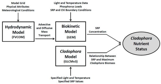 The modeling platform utilized in this work illustrating the three component modules (hydrodynamics, biokinetics and Cladophora nutritional status) and their inputs, outputs and interactions.
