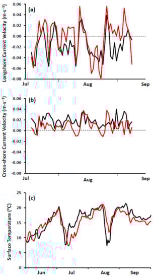 Performance testing of the hydrodynamic model (FVCOM): (a) daily averaged longshore current velocity at 5 m; positive values are W→E and negative values E→W, (b) cross-shore current; positive values are onshore, N, and negative values are offshore, S and (c) surface temperature measured at National Data Buoy Center (NDBC) Buoy 45159 (Supplementary Material, Figure S1).