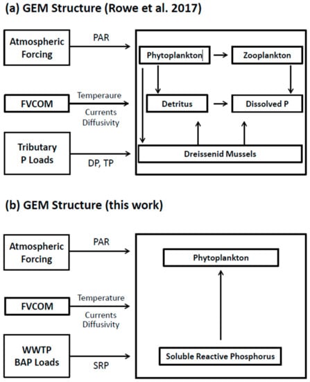 Conceptualization of the phosphorus–phytoplankton dynamics (GEM) model as applied (a) by Rowe et al. [] and (b) in this work.