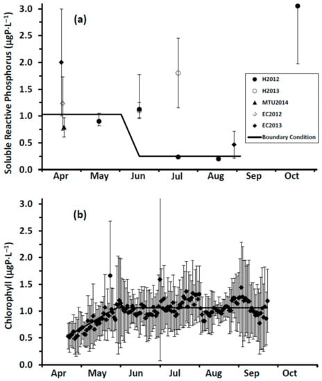Determination of boundary conditions: (a) soluble reactive phosphorus and (b) chlorophyll; with bars representing the standard deviation of the mean daily value.
