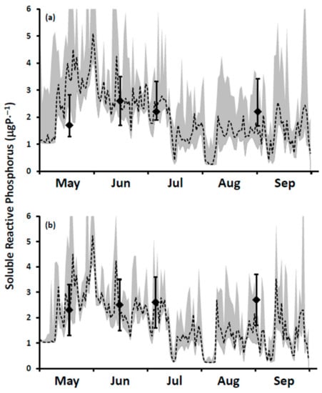Results of model performance testing for soluble reactive phosphorus concentrations in 2016: (a) surface water and (b) bottom water. Diamonds represent observed median concentrations with the 25th and 75th percentiles indicated by bars. Dashed line represents daily median modeled concentrations with the 25th and 75th percentiles for each daily median shaded in gray.