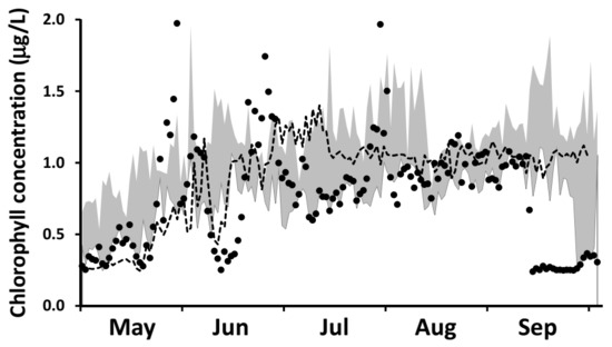 Results of model performance testing for surface water chlorophyll. Circles represent 2016 observed concentrations and the dashed line represents 2016 median modeled concentrations. The gray shaded area represents the 25th and 75th percentiles for daily observations over the (expanded) 2012–2016 interval, included to reflect observed interannual variability.