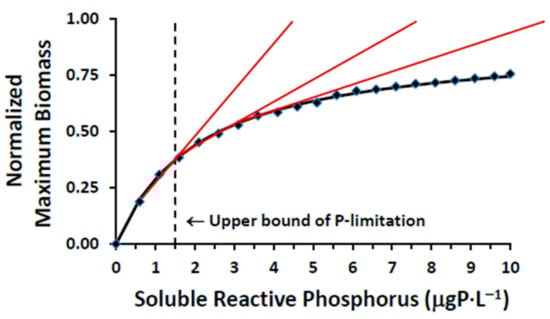 In order to represent the phosphorus–Cladophora dynamic in a management context, e.g., analysis of the impact of increasing phosphorus loads and the efficacy of improved phosphorus removal, it is necessary to specify a target concentration that is ecologically meaningful in such applications. Here we use the upper bound of the range of SRP concentrations reflecting P-limited growth and thus responsive to management of ambient SRP. That upper bound was established by applying the GLCM v3 to develop a relationship between ambient SRP concentration and seasonal maximum Cladophora biomass (Figure 10). The rate of biomass accrual is seen to increase in a linear fashion with SRP to a concentration of ~1.5 μgP⋅L−1. Beyond this point the relationship departs from linearity, indicating the onset of P-saturation, and eventually reaches a P-saturated asymptote.