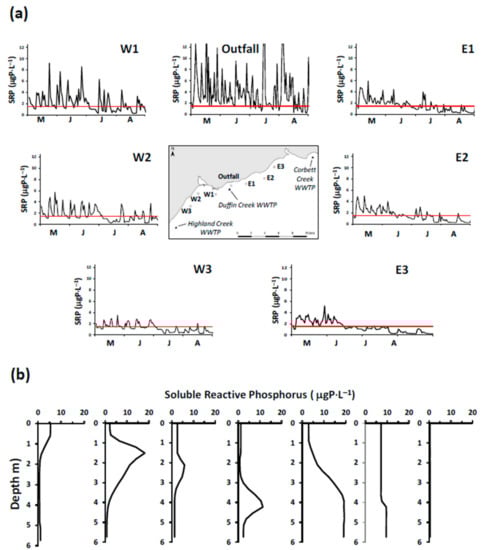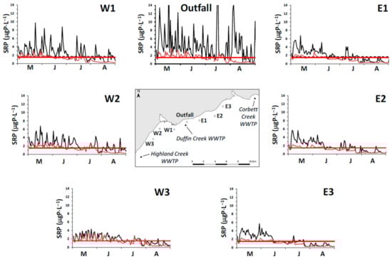 It is a challenge to identify true open lake boundary values for SRP at a site influenced by P-rich effluents from multiple WWTPs. This is especially the case here for locations within the footprint of the Duffin Creek WWTP []. SRP concentrations exceeding the offshore boundary level are observed downcurrent of the plant’s outfall [], with the position of the plume varying at a frequency of hours to days []. Additionally, temporal variation in offshore boundary SRP concentrations (seasonal reduction by a factor of 5 in Lake Michigan [] may be observed following the onset of thermal stratification.