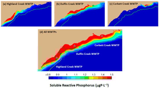 Loads input to the FVCOM-GEM model do not include chlorophyll, as concentrations of algal biomass in tributary and point source discharges are negligible. Similarly, tributary phosphorus inputs are not included here, as these account for only ~1% of the total SRP load during the spring–summer Cladophora growth period (see []). Thus, phosphorus load determination is limited to that from the Highland Creek, Duffin Creek and Corbett Creek WWTPs (Figure 1), with daily average discharge and TP concentrations obtained from Annual Performance Reports for the three WWTPs. The Duffin Creek WWTP experienced atypically high effluent phosphorus levels from October 2014 through 2016, due in part to having treatment units offline for refurbishment (lower residence time, less efficient sedimentation). While data for 2016 (Table 2), the year with the most spatially and temporally complete in-lake SRP data, serve well in testing model performance (Section 5.1), effluent SRP concentrations for the period January through September 2014 (Table 2) better represent typical operating conditions (2011–September 2014) and were selected for use in simulating engineering options (Section 5.2).