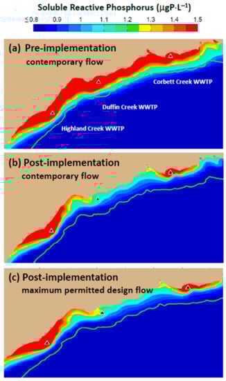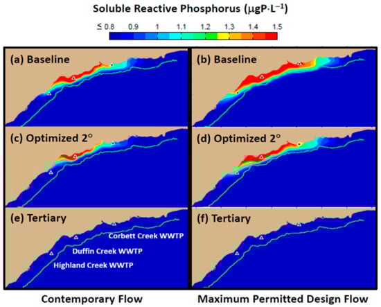 In 2016, the Minister of the Environment, Conservation and Parks for the Province of Ontario (MECP) issued an order requiring that the Duffin Creek WWTP prepare a Phosphorus Reduction Action Plan (PRAP) to determine the lowest levels of effluent phosphorus achievable for both current (contemporary flow of 343,000 m3⋅d−1) and future (maximum permitted design flow of 630,000 m3⋅d−1) operating conditions. Development of the PRAP considered three levels of phosphorus removal: a contemporary Baseline case (chemically enhanced secondary treatment), an Optimized Secondary Treatment case (Baseline case with optimum chemical dosing locations and combinations of iron and polymer) and a Tertiary Treatment case (chemically enhanced secondary treatment with ballasted flocculation). The analysis presented here simulates nearshore SRP concentrations and nutritional status of Cladophora (P-limited or P-saturated growth) across the matrix of flows and treatment options specified in the Duffin Creek WWTP PRAP. Testing of model performance includes contemporary discharges from the Highland Creek and Corbett Creek WWTPs, located to the west and east of the Duffin Creek plant, respectively. Future scenarios (engineered options) are examined for the Duffin Creek WWTP as a standalone discharge and in concert with discharges for the Highland Creek and Corbett Creek WWTPs. The analysis seeks to determine, as well, the impact of increases in the volume of flow treated and the accompanying increase in bioavailable phosphorus (BAP) load from the Duffin Creek WWTP and the efficacy of treatment strategies at the facility in reducing effluent BAP concentrations (pursuant to the PRAP).